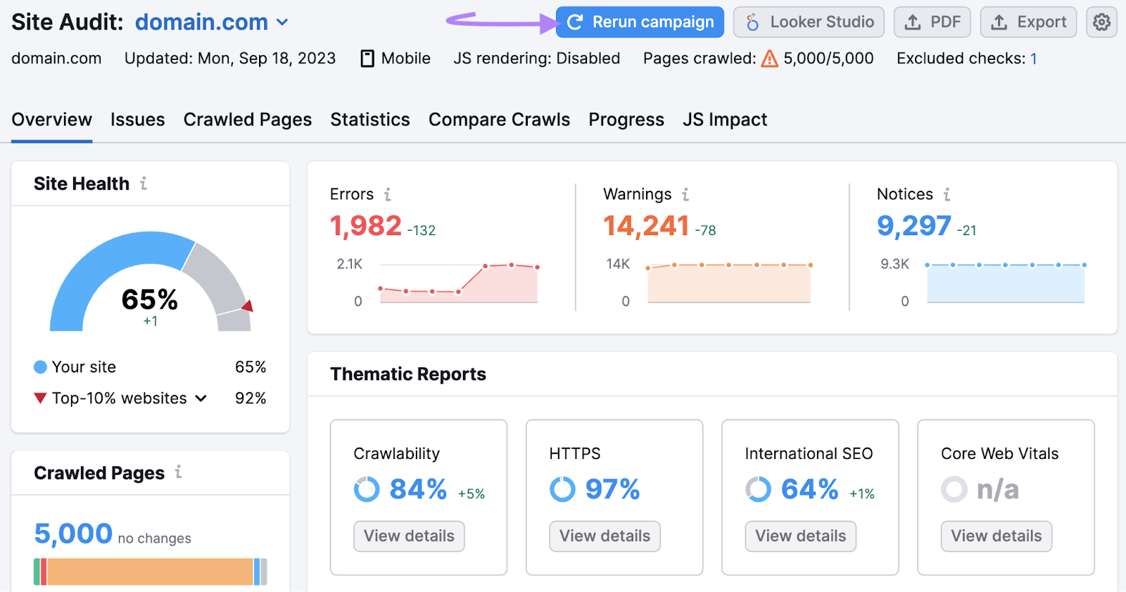 Check for link issues at scale with Semrush’s Site Audit tool.