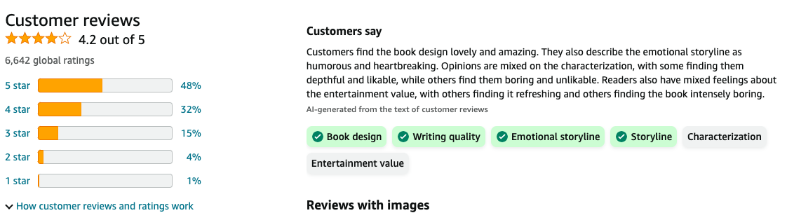 Below is an example of a review section featuring written reviews and a star rating for a book sold on an ecommerce website.