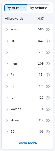 The left-hand side of Keyword Magic Tool search results shows a list of categories to help filter your possible keyword options. Use this to align your keyword research more accurately with the content on your product pages.