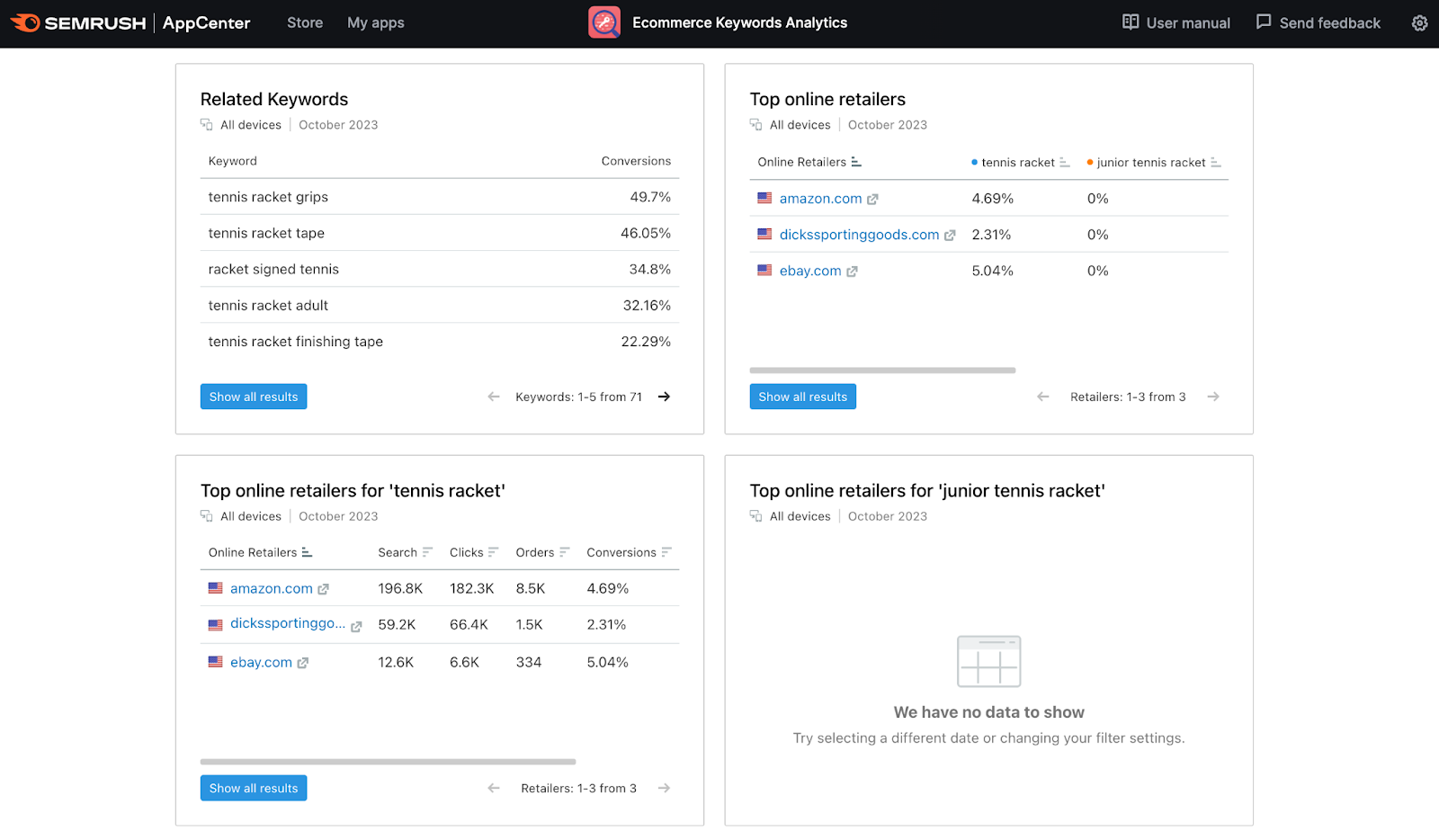 Ecommerce Keyword Analytics is a unique keyword research app that offers valuable information about ecommerce keywords being searched on leading retailers' domains (like amazon.com and target.com).