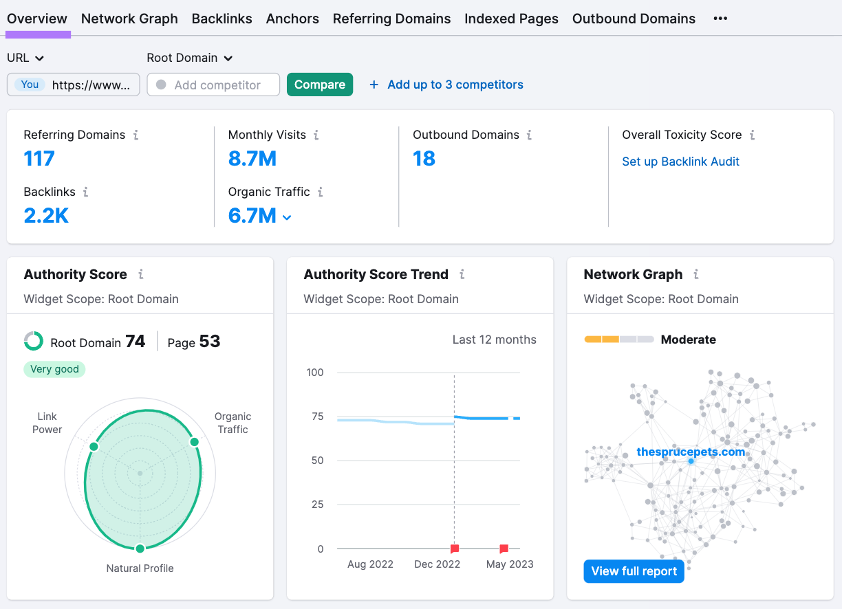 To check your backlinks, use Semrush’s Backlink Analytics tool.
