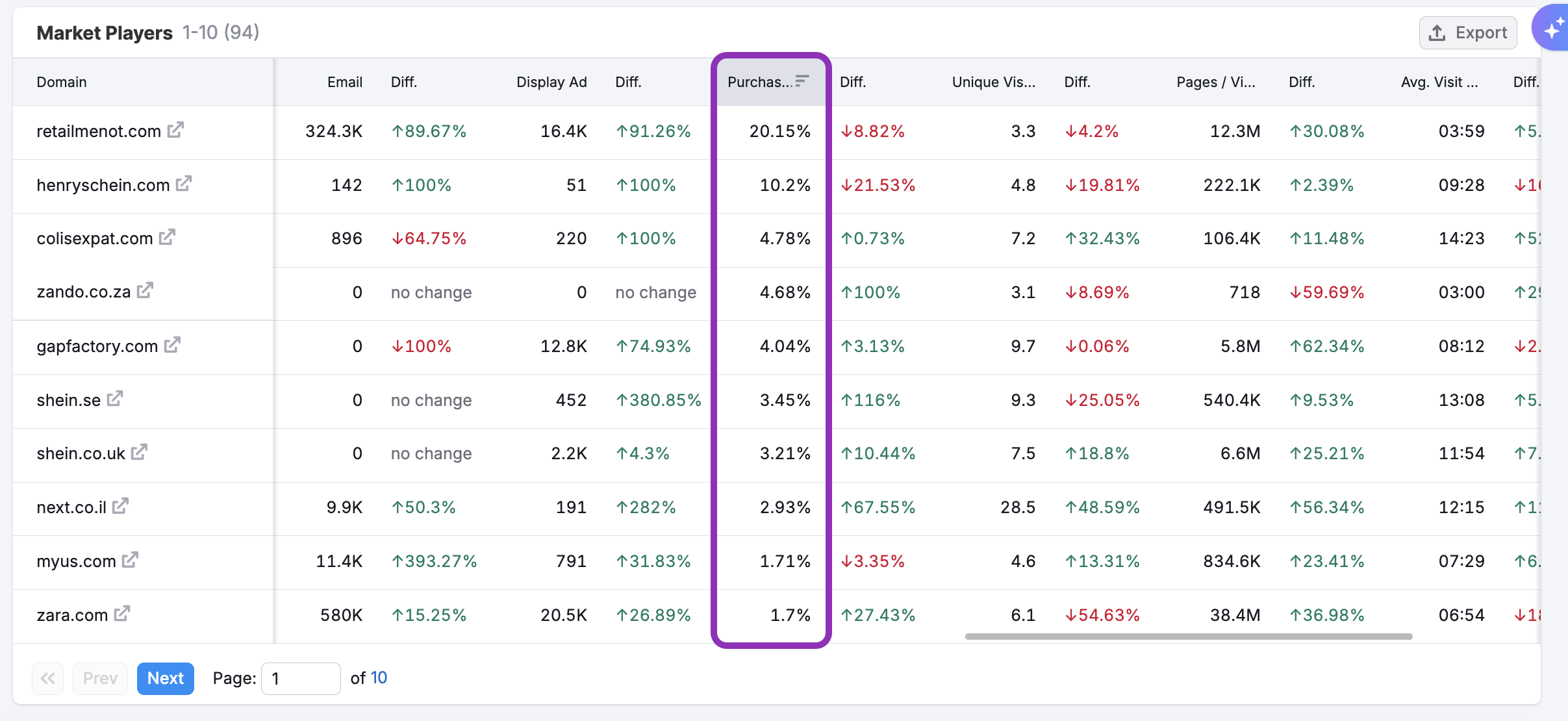 Using the Market Overview dashboard found inside the Traffic & Market Toolkit, we analyzed the Apparel & Fashion industry using the Market Players section of the dashboard. The tool gathered data for 100 top domains adjacent to our target domain shein.com, and we filtered by Purchase Conversion to see which domain had the highest rate.