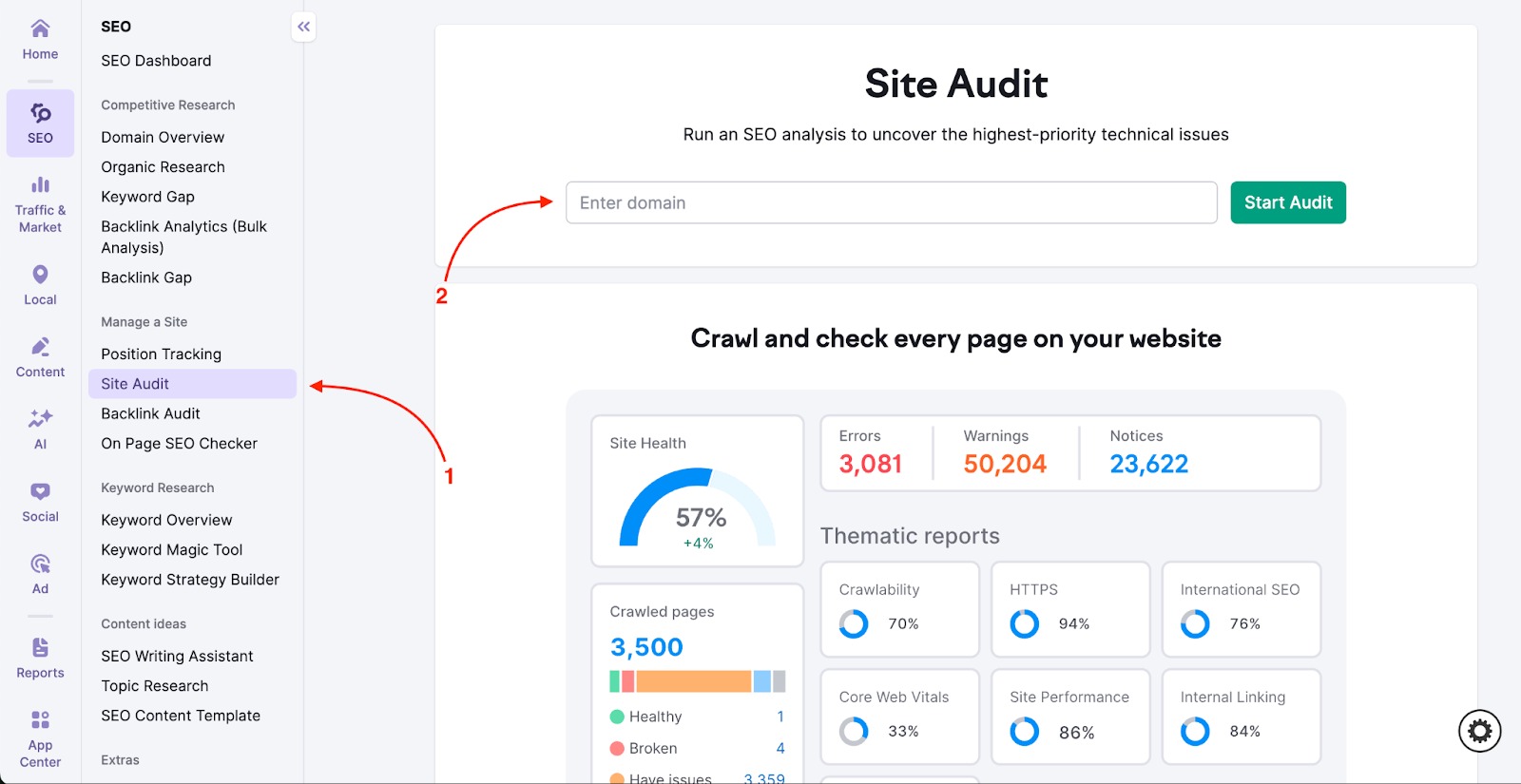 Technical SEO errors can hold back your site and negatively impact rankings, overall visibility, and conversions. To identify and fix such issues quickly, use the Semrush Site Audit Tool. It crawls a domain and creates a report to show where there are potential problems and suggests recommendations on how to improve your website’s technical health. Site Audit offers a range of thematic reports covering crawlability, HTTPS, site performance, Core Web Vitals, and more.