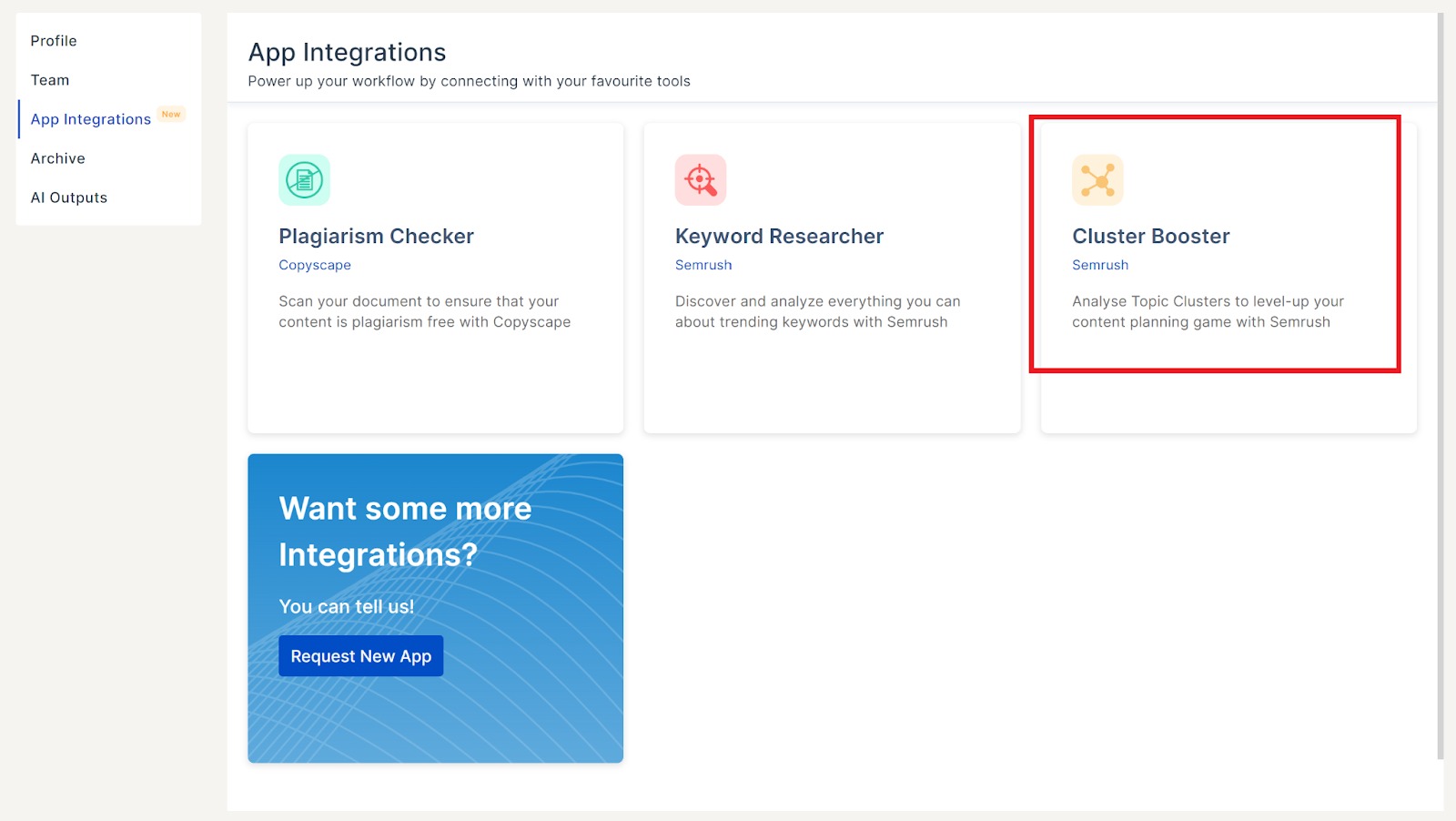 Go to “My Account,” select “App Integrations,” and open “Keyword Researcher.” If you’ve already connected Cluster Booster, you do not need to enter your Semrush login details again.