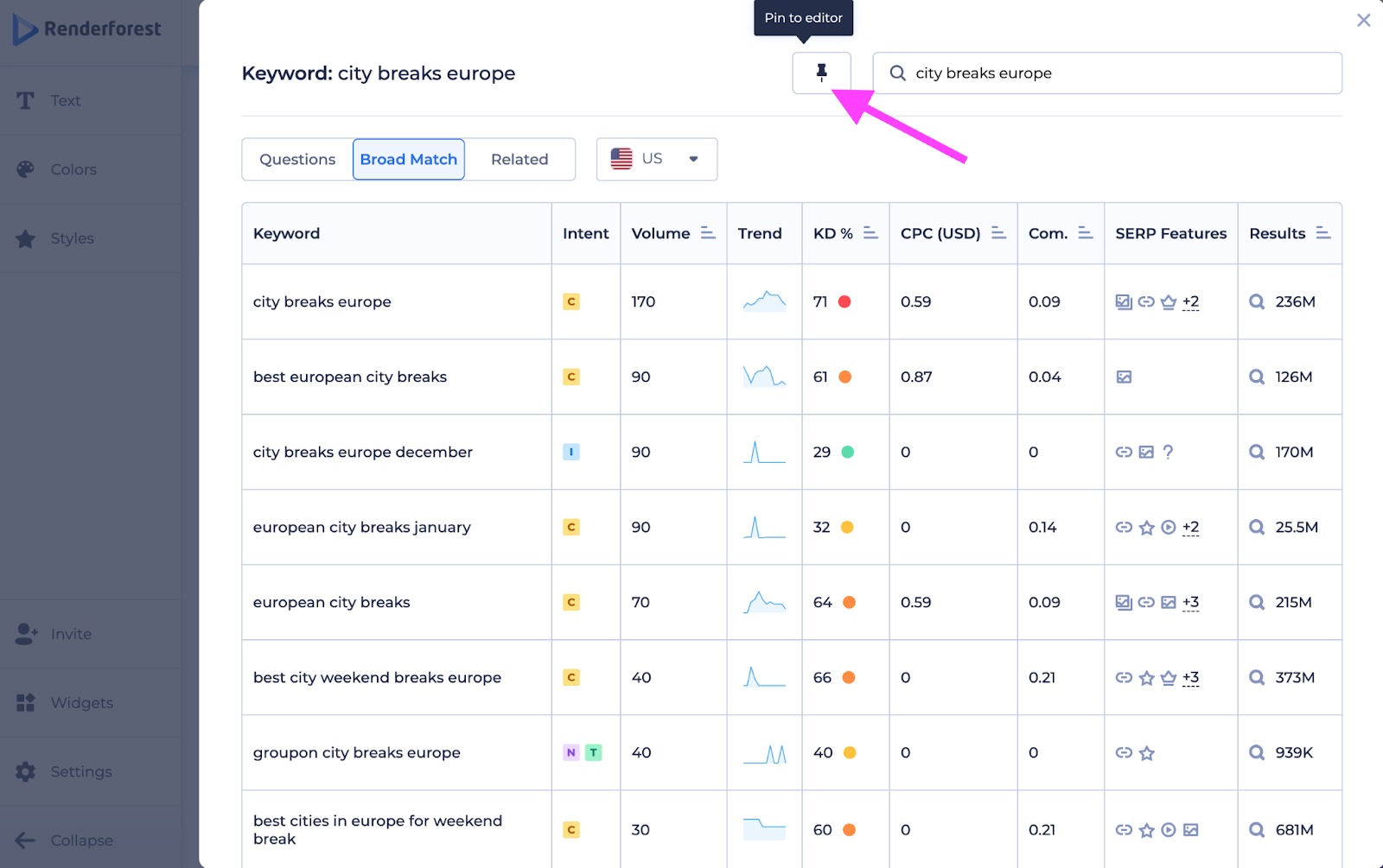 With the Semrush-Renderforest integration, you can see eight different Semrush keyword metrics for every keyword you research, right from within the tool.