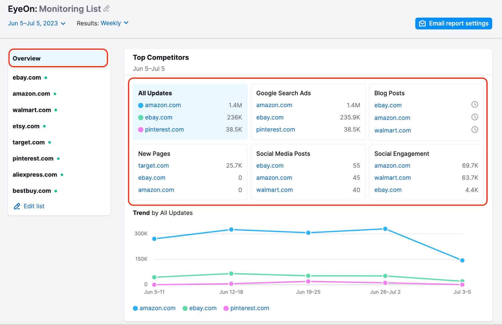 The EyeOn app can also send weekly updates straight to your inbox. This timely intel about competitors can help you keep an edge in the market and swiftly respond to shifting trends.